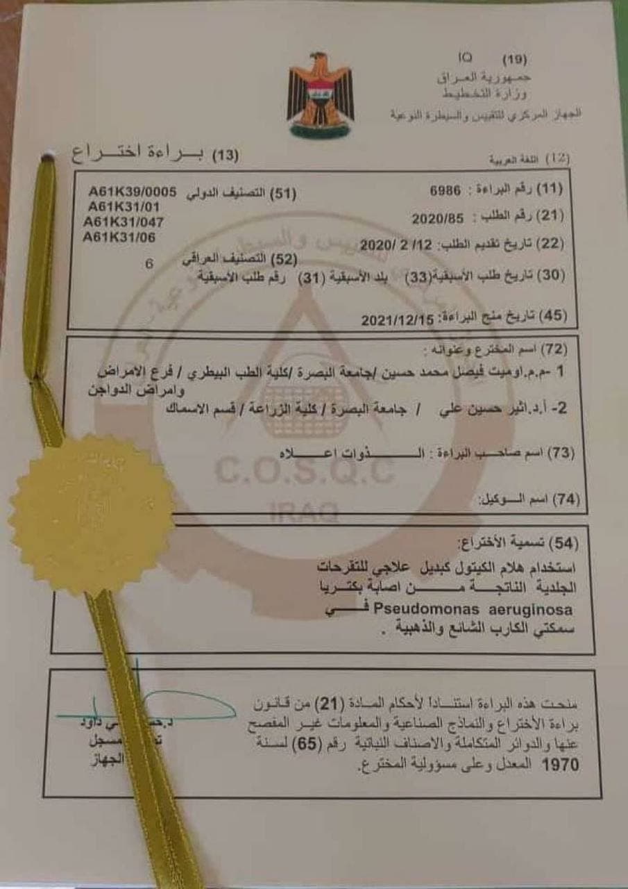 A research team at the College of Veterinary Medicine and the College of Agriculture at the University of Basrah, consisting of the instructor Umit Faisal Muhammad Hussein and Dr. Atheer Hussein Ali, obtained a patent for discovering a treatment used for skin ulcers caused by pseudomonas aeroginosa bacteria in common and gold carp fish.