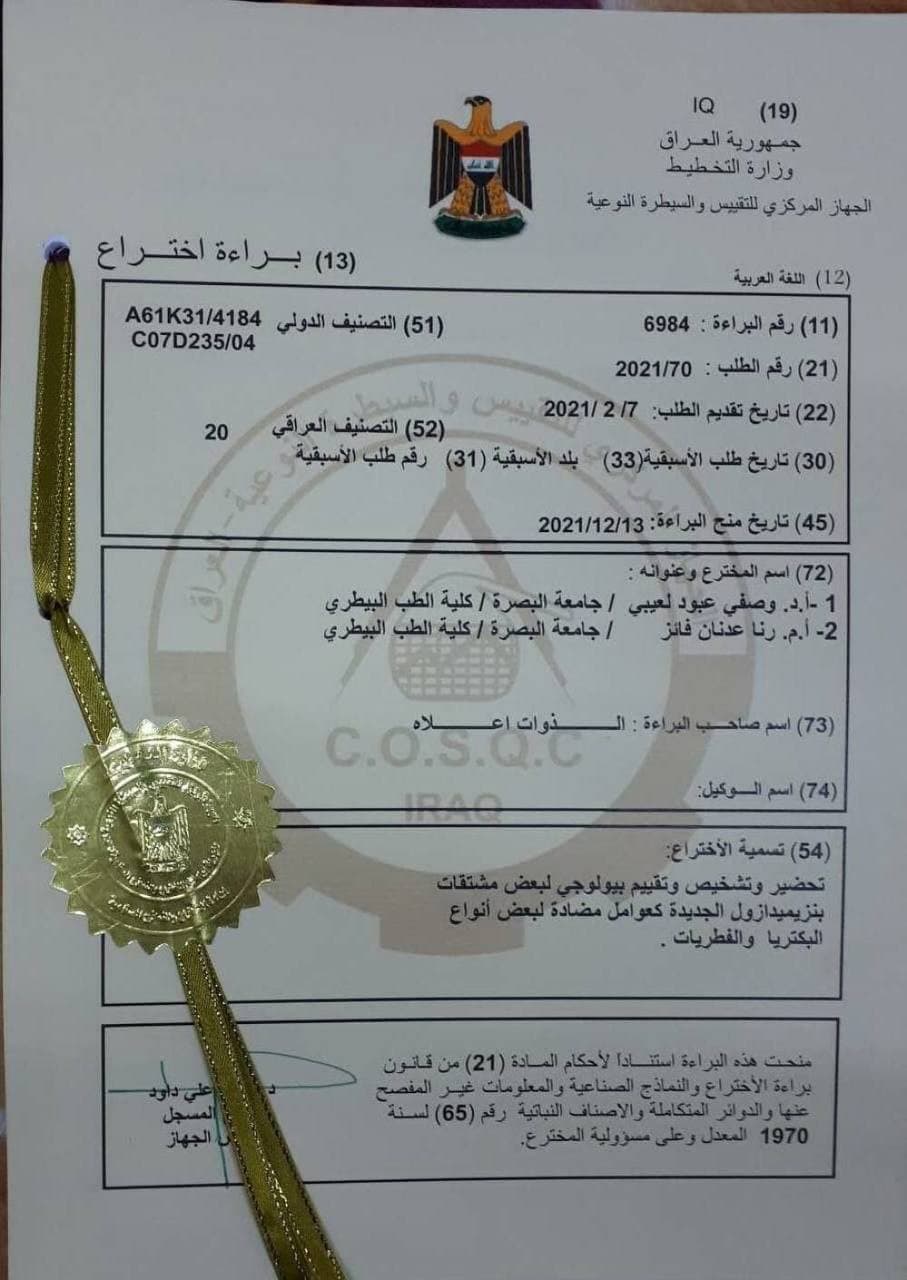 A research team at the College of Veterinary Medicine at Basrah University, consisting of Dr. Wasfi Aboud Al-Masoudi and Dr. Rana Adnan Fayez, obtained a patent for preparing new (benzimidazole) derivatives as anti-bacterial and anti-fungal.