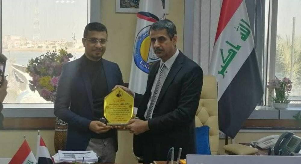 The honor included giving him a shield of thanks and appreciation for his great efforts in completing the Basrah University contract file and following up on allocation orders and financial differences.