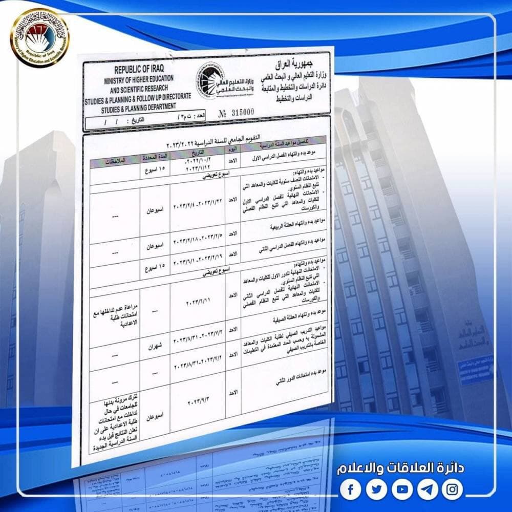 In accordance with the perspective of its mission, vision and academic programs responsible for achieving the studied results, the Ministry of Higher Education and Scientific Research announces the adoption of the university calendar for the undergraduate study for the next academic year 2023/2022, whose first semester begins on the 2nd of next October and continues for fifteen weeks ending on the twelfth of January 2023 then start the exams and the spring holiday. After that, the second semester begins on 19/2/2023 and ends on 2/6/2023, followed by the semester and final exams and the summer holiday for the teaching staff, which lasts for two months, starting from 7/2/2023 until 31/8/2023.