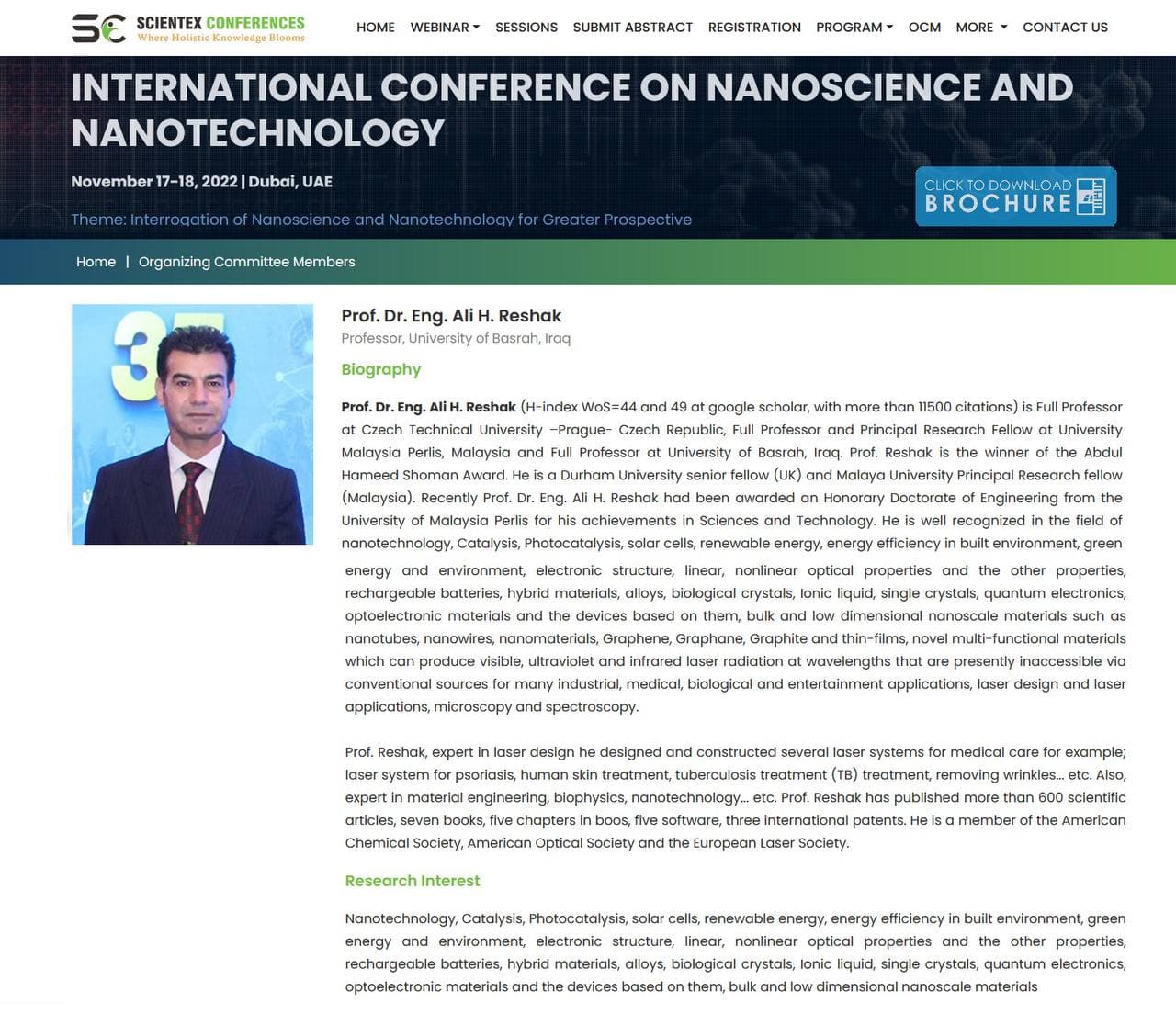 The instructor at the Department of Physics at the College of Science, University of Basrah, Dr. Ali Hussain Rashak, was chosen as a member of the Organizing Committee of the International Scientific Conference of Nanoscience and Nanotechnology, which will be held in Dubai for the period from 17-18 November 2022.