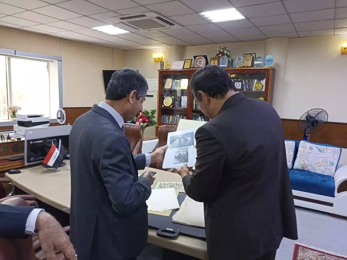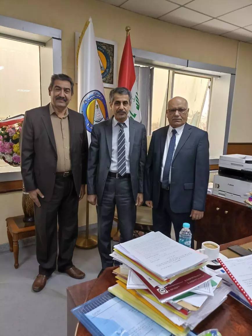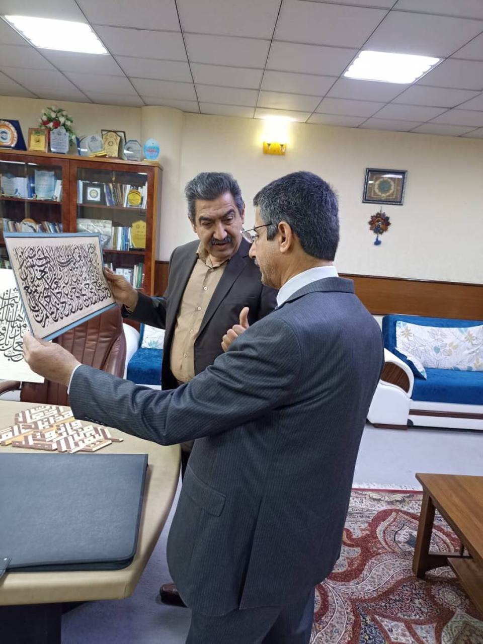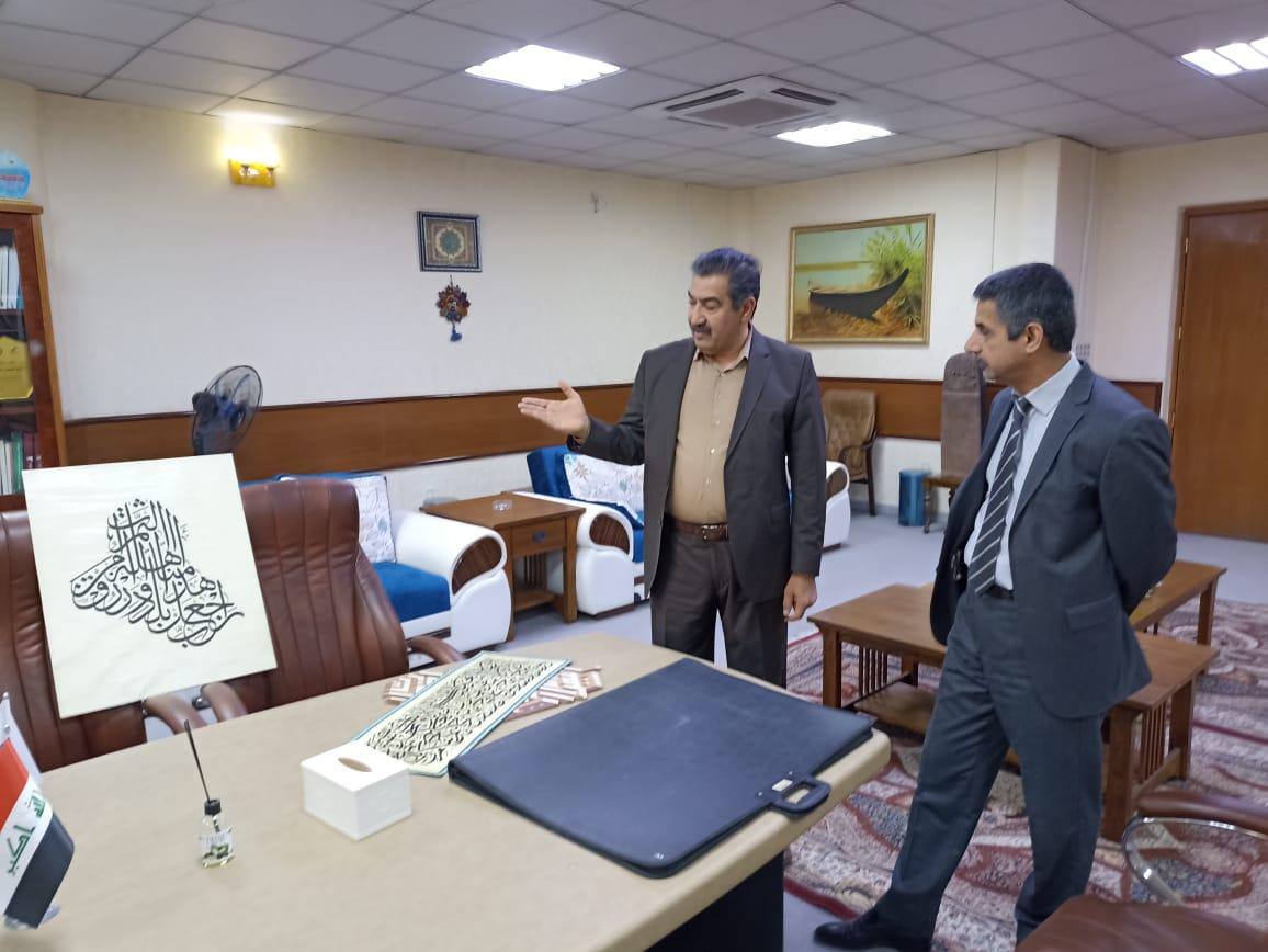 The President of Basrah University, Dr. Saad Shaheen Hammadi, received an instructor of Arabic calligraphy at the College of Fine Arts at the University of Baghdad, Abdul Kareem Abd Thabet.