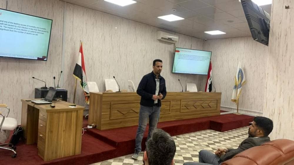 The panel discussion included a lecture given by the student Ahmed Nizar Manahi Muhammad Al-Jaari, in which he discussed an attempt to scan the antigens present in the natural flora bacteria and probiotics by measuring the level of antibodies attached to the antigens of the Corona virus and their cross-ability to combine with the antigens of the bacteria above.