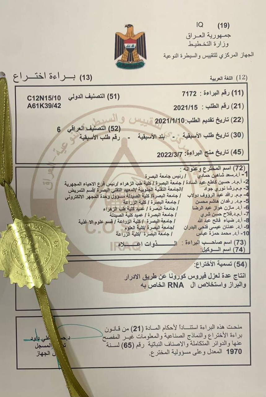 A research team at the College of Pharmacy at the University of Basrah, consists of Dr. Falah Hassan Shari, Dr. Rafid Abdul-Raouf Dolab, and Dr. Raghadan Hashem Mohsen, obtained a patent for producing a kit to isolate the Corona virus through urine and stool and extract its RNA.