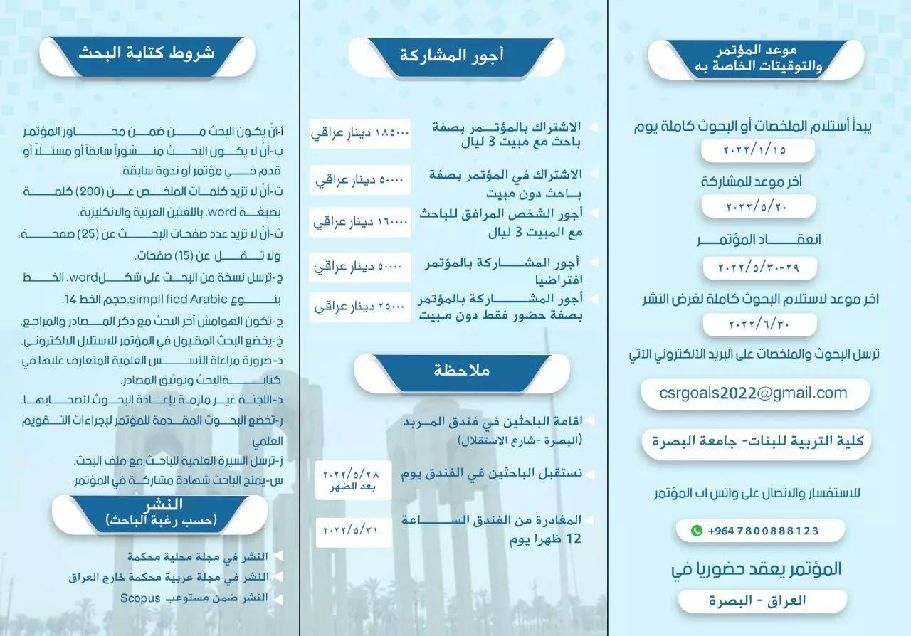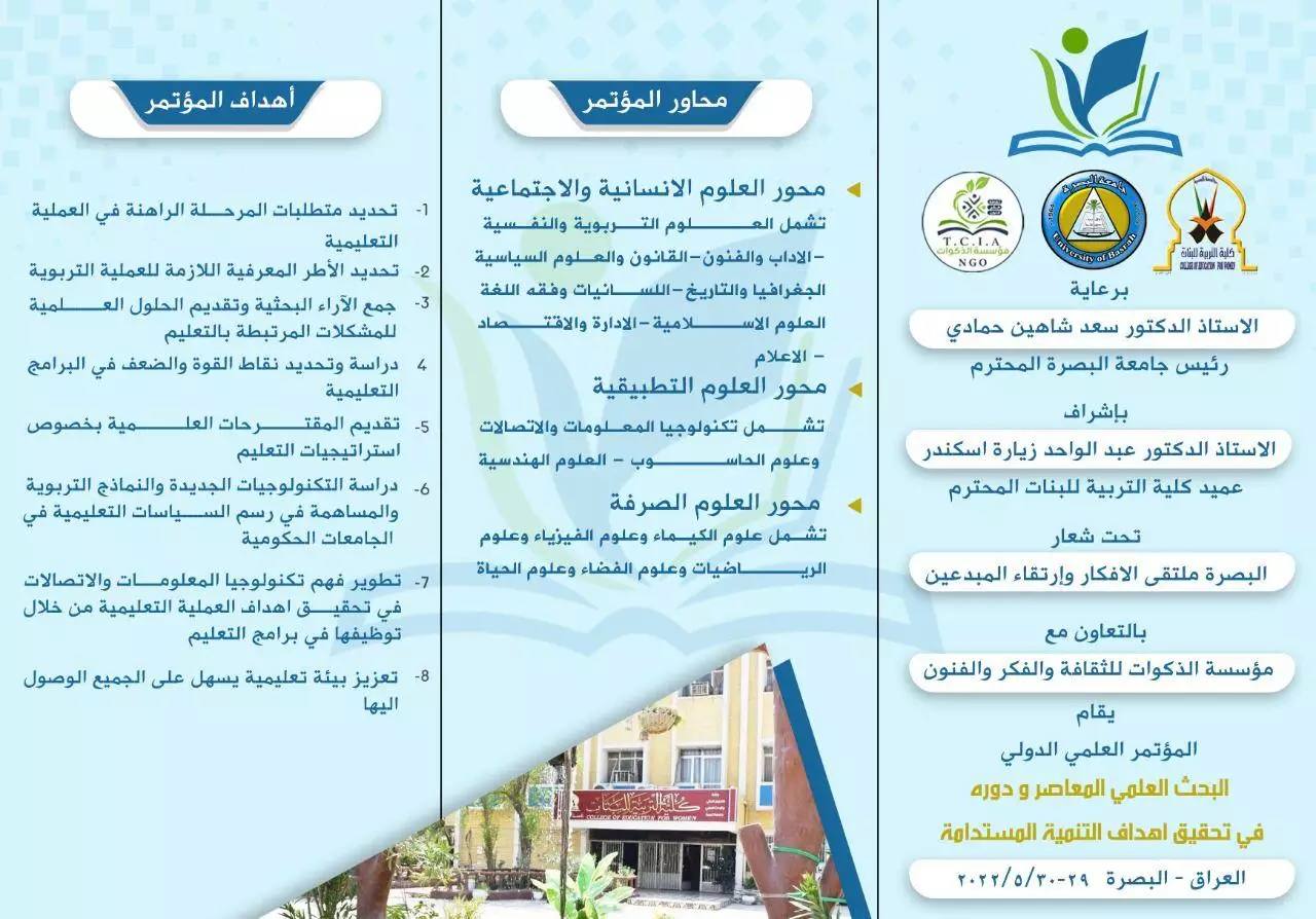 Under the patronage of the President of the University of Basrah, Prof. Dr. Saad Shaheen Hammadi, the College of Education for Women at the University of Basrah is holding the International Scientific Conference entitled “Contemporary Scientific Research and its Role in Achieving Sustainable Development Goals” for the period from 29-30/5/2022.