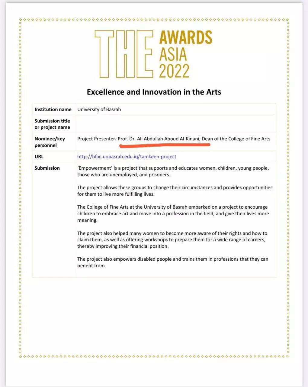 The College of Fine Arts at the University of Basrah has been nominated among the best eight colleges in the world in the (THE) classification to win the Oscars in higher education, topping the world's largest universities.