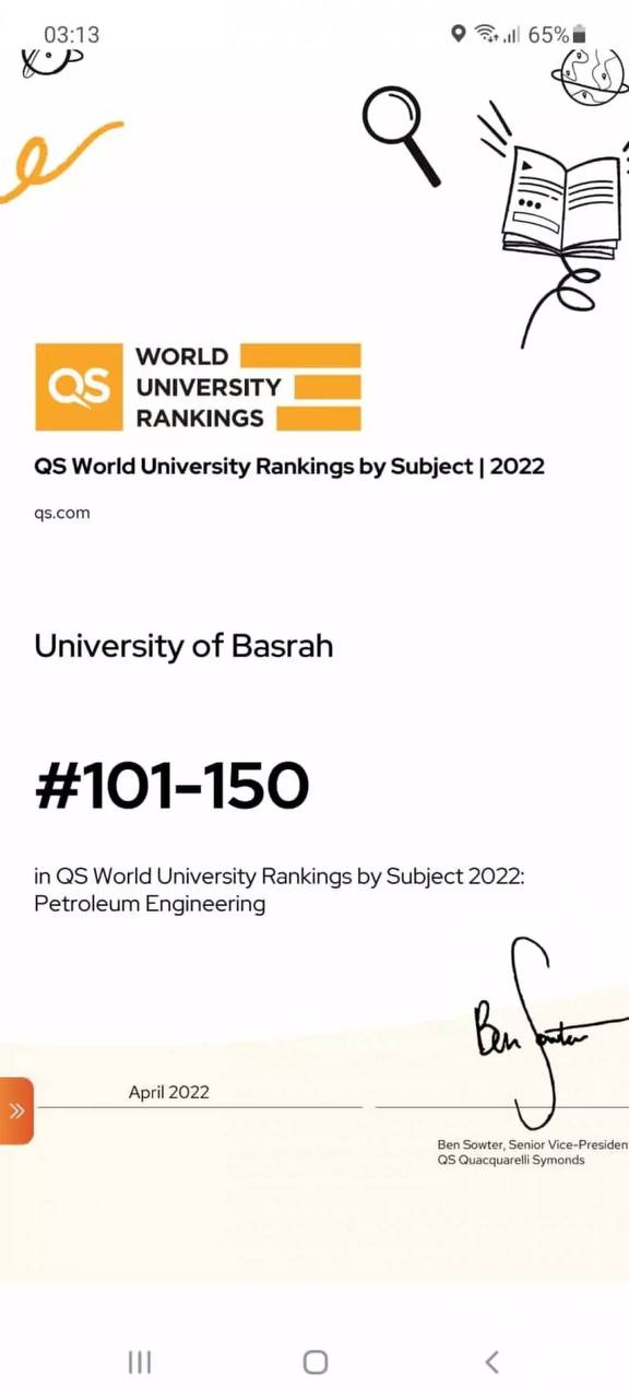 The latest version of the QS of subject 2022 ranking showed that the University of Basrah is one of the best universities in the world according to the latest version of the ranking of the most consulted universities in the world, and the best performance of the University of Basrah was in petroleum engineering.