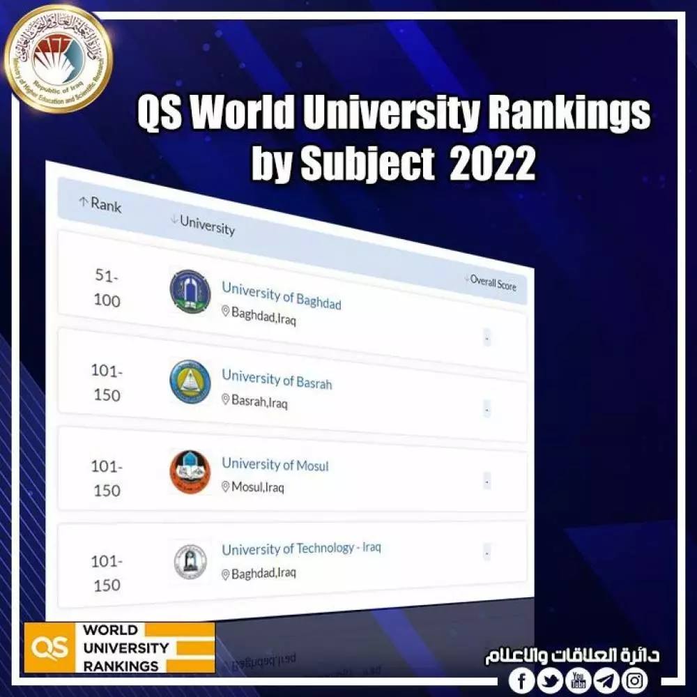 Ministry of Higher Education and Scientific Research announced o that the Universities of Baghdad, Basrah, Mosul and Technology obtained important competitive scores in the QS World Ranking of its edition of scientific specialties for 2022.
