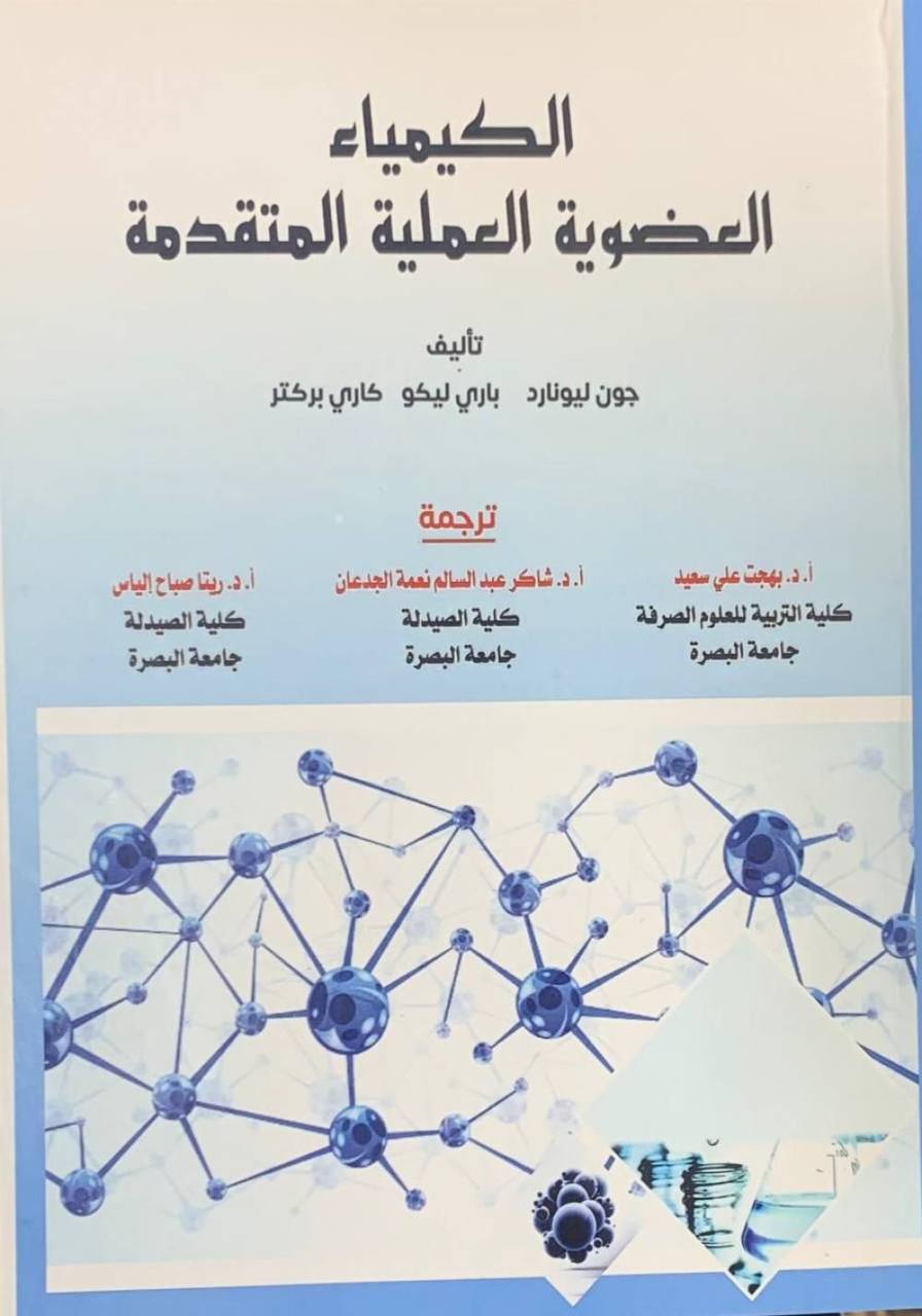 Instructors at the College of Pharmacy at the University of Basrah, Dr. Shakir Abdul-Salem Nehme, Dr. Rita Sabah Elias, and the instructor at the College of Education for Pure Sciences, Dr. Bahjat Ali Saeed, translated the book (Advanced Scientific Organic Chemistry) by authors John Leonard, Barry Leeko and Carrie Prector from English into Arabic.