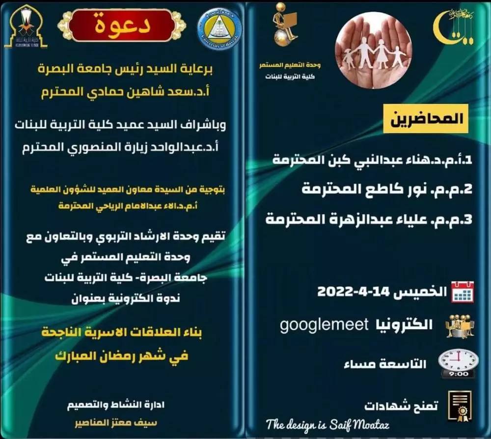 The Educational Guidance and Psychological Care Center at the University of Basrah, in cooperation with the Colleges of Education for Women and the Fine Arts, organized a symposium on successful family relations during the holy month of Ramadan.