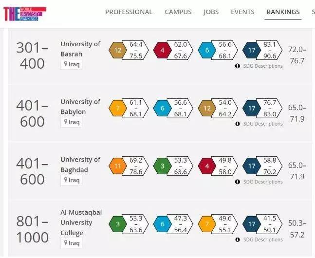 Forty-seven Iraqi universities and colleges registered competitive positions in the Times classification for sustainable development for 2022, which included (1406) institutions from (106) countries around the world. The official published results indicated that the University of Basrah ranked (301-400) globally, then Babylon University (401-600), and the University of Baghdad ranked (401-600).