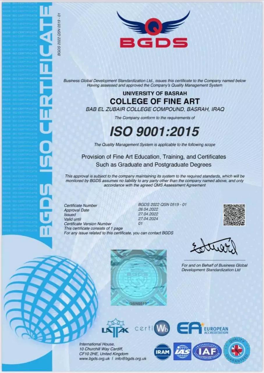 The College of Fine Arts at the University of Basrah obtained an international quality certificate (ISO 9001) from the British International Business Development Organization for Standardization (BGDS) as part of the college's endeavor to develop and improve performance.