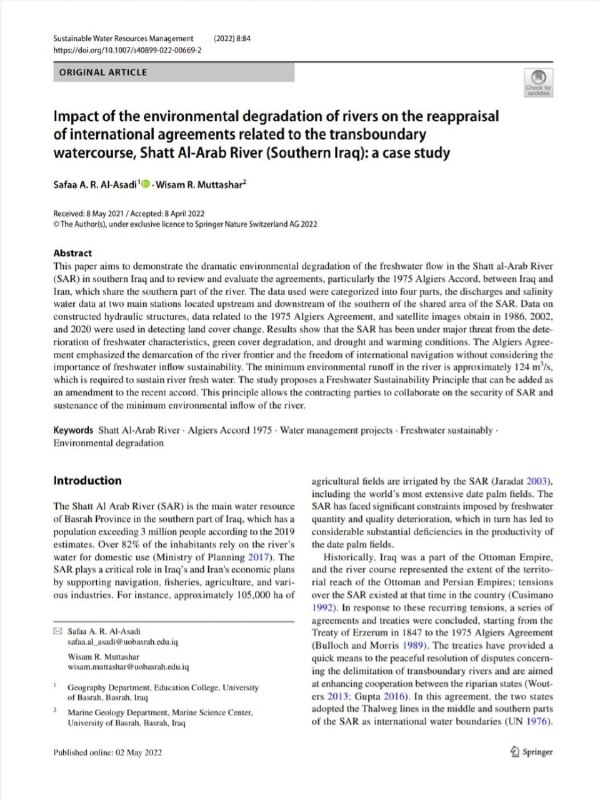 The teaching professor at the College of Education for Human Sciences - University of Basra, Prof. Dr. Safaa Abdul-Amir Rasham Al-Asadi, has published a joint research entitled (The Impact of Environmental Degradation in Rivers on the Re-evaluation of International Agreements Related to Cross-Border Watercourses. Shatt Al-Arab River - Southern Iraq - Case Study) in a journal (Sustainable Water Resources Management), a solid international magazine within the containers of (SCOPASS) publishing house (Sprinker).
