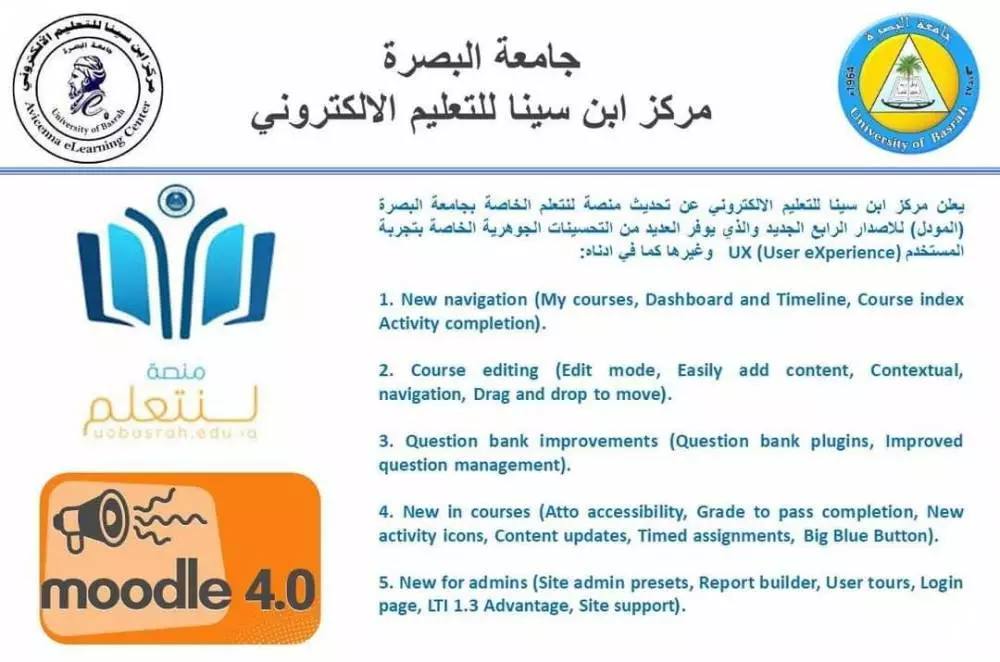 The Avicenna Center for E-Learning at the University of Basrah updated the university's (Let’s learn) e-learning platform to the fourth version (Moodle 4.0), which conforms to the standards and specifications of the international company for open source e-learning.