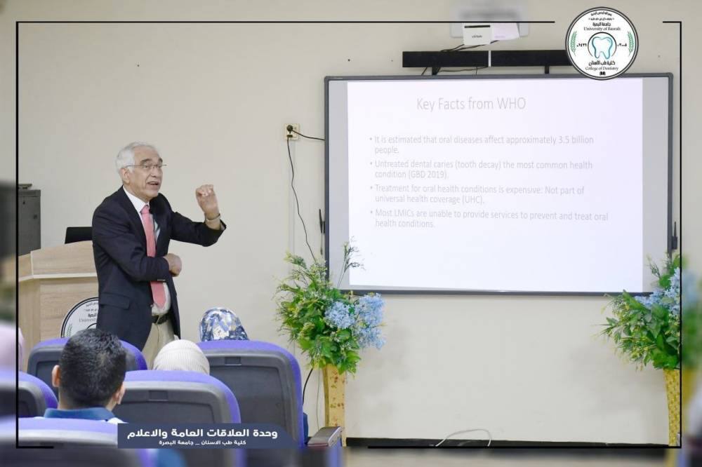 The College of Dentistry at the University of Basrah organized a scientific lecture on dental public health delivered by one of the professors of the Royal University of London, Professor Dr. Salman Al-Rawaf.