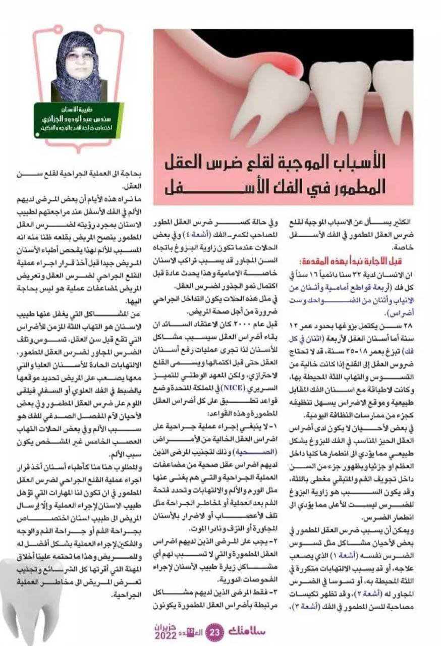 The article, which was titled "The Reasons for Extracting an Impacted Wisdom Tooth in the Lower Jaw" included a full explanation of the reasons for wisdom tooth extraction, including the tooth that may not have a suitable space for its eruption naturally, or the angle of eruption of the tooth is not upward, which leads to its complete or partial eruption. It also indicated the problems which may be caused by the impacted wisdom tooth from decay and inflammation of the gums or cause the overlap of the teeth, especially the front ones. In this case, the surgical intervention is necessary for the health of the patient.
