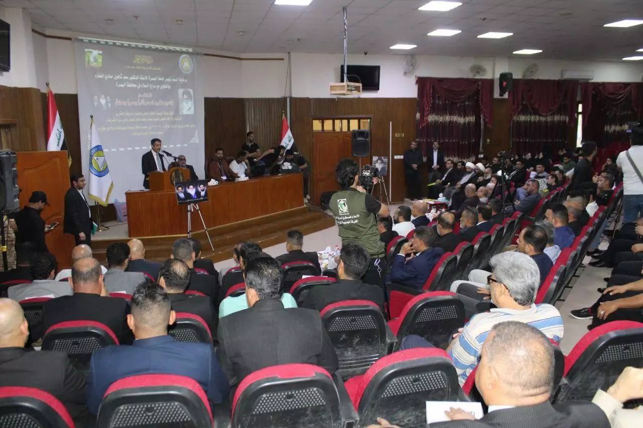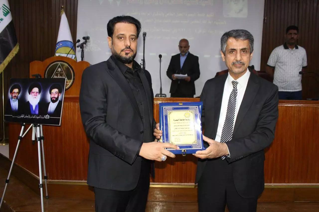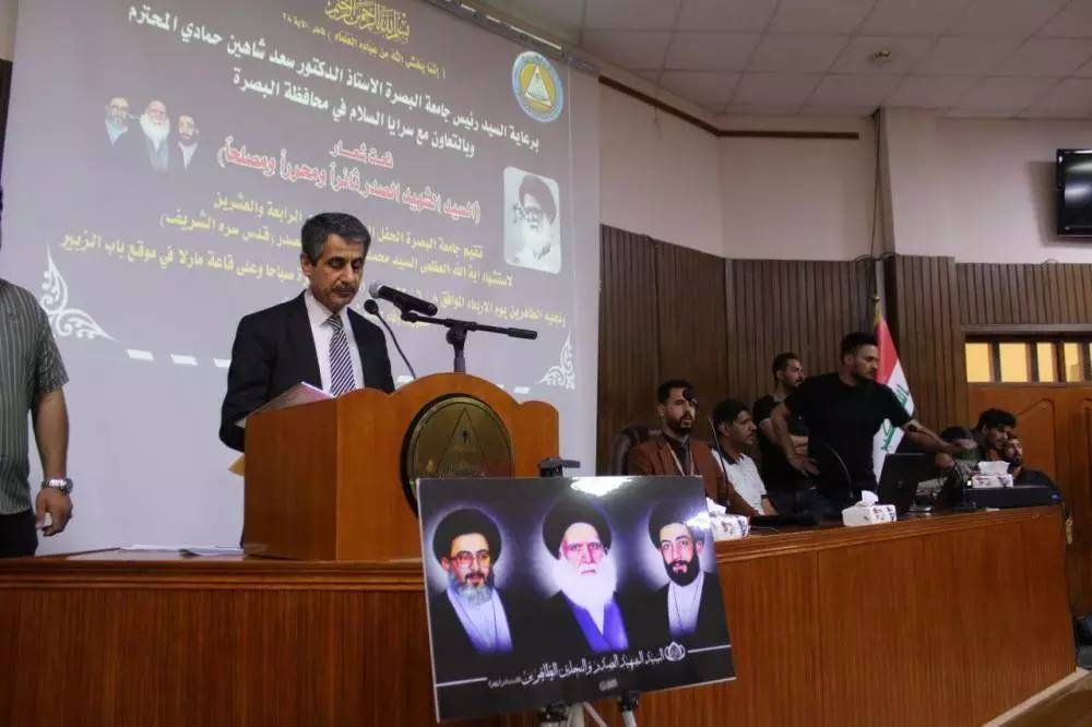 The University of Basrah, in cooperation with the Sarata Al-Salam in Basra, organized a memorial forum to commemorate the 24th anniversary of the martyrdom of Sayyid Muhammad Muhammad Sadiq al-Sadr (may God sanctify his soul) and his two sons. The University President, Dr. Saad Shaheen Hammadi, said in a speech at the opening ceremony, “Our commemoration of the martyrdom anniversary of Sayyid Muhammad al-Sadr after all these years is a clear evidence of the continuity of his blessed efforts and that his efforts did not go with the wind and that his jihad and scientific biography can be recorded within the course of reformers in history because of his eligibility and great ability to reformulate the history of the Islamic nation, which was intended to disappear in that era, scientifically, ideologically and religiously.