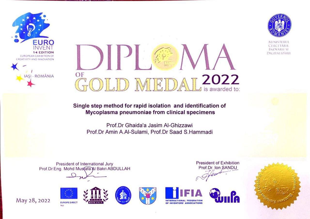 The scientific team won, by participating with the study titled(Single step method for rapid isolation and identification of Mycoplasma pneumonia from clinical specimens), the gold medal with the participation of more than 65 countries and 500 international researchers.