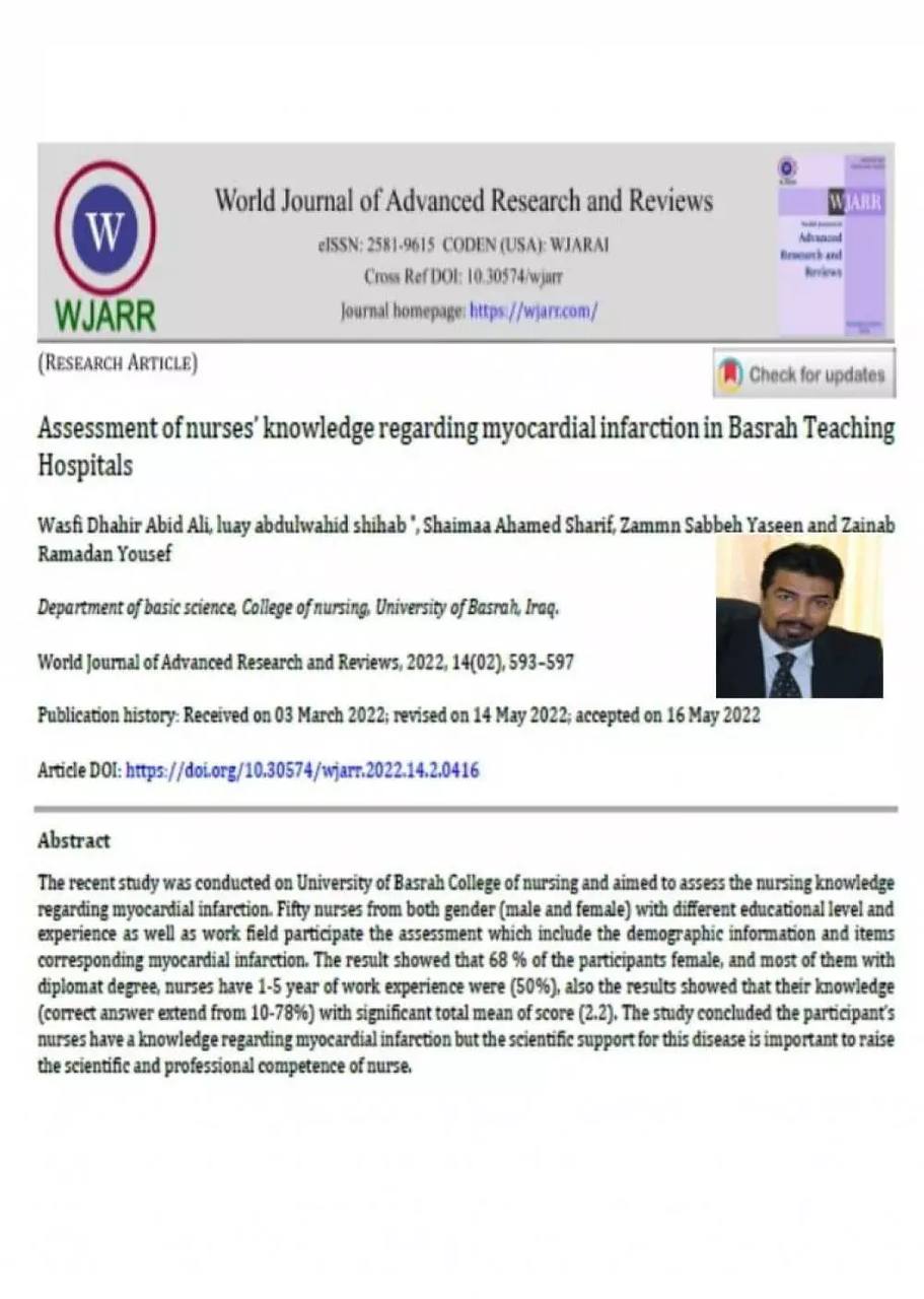 The two faculty members at the College of Nursing at the University of Basrah, Dr. Wasfi Zahir Abd Ali and researcher Louay Shihab Abdel Wahed, with the participation of a number of college students, published a paper entitled (Assessment of nurses' knowledge of myocardial infarction).
