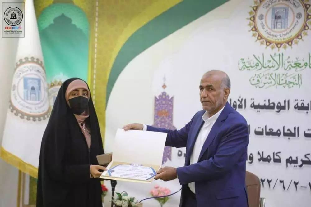 Basrah University won the second and third places in the first national Quranic competition for memorizing and reciting the entire Holy Quran for female students of Iraqi universities, organized by the Islamic University of Najaf, with the participation of (40) female students to represent (15) competing universities in the fields of memorizing the entire Quran and its recitation.