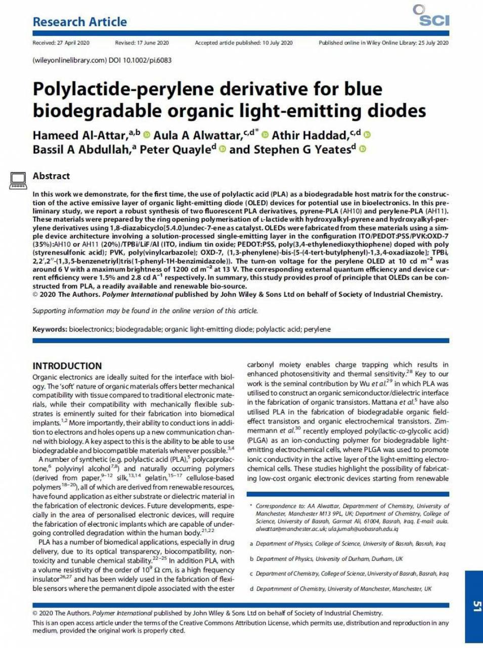 A scientific study entitled (Polylactide-perylene derivative for blue biodegradable organic light-emitting diodes) was conducted at the College of Science at the University of Basrah by the faculty members, Dr. Ola Ali Al-Watar, Dr. Atheer Mahmoud Haddad, and Dr. Basil Ali Abdullah, in partnership with researchers from the University of Manchester in Britain.
