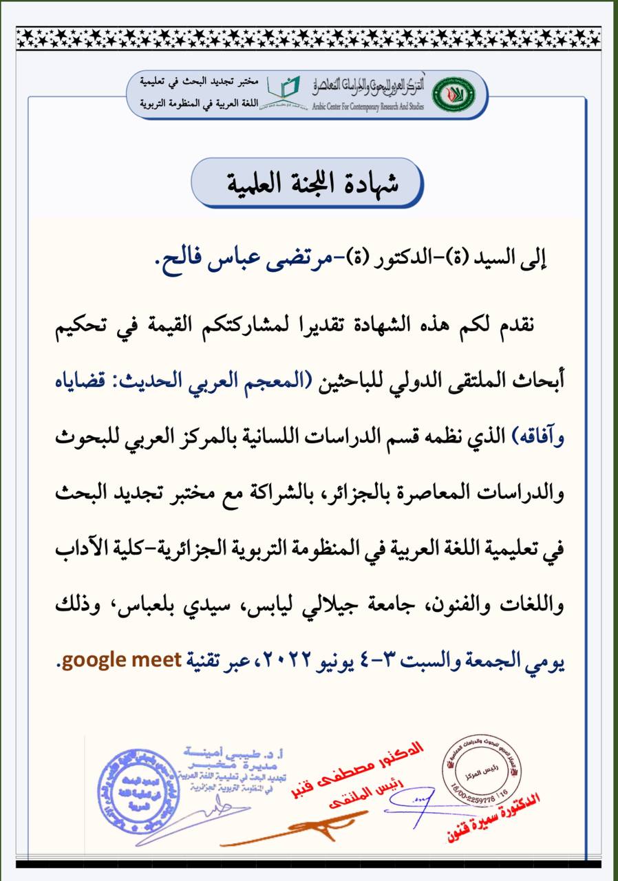 The teacher at the Faculty of Education for Human Sciences (Prof. Dr. Mortada Abbas Faleh) received a certificate of appreciation from the State of Algeria; For his participation in the scientific committee for the arbitration of the research of the International Forum of Researchers (The Modern Arabic Dictionary: Its Issues and Prospects), which was organized by the Linguistic Studies Department of the Arab Center for Research and Contemporary Studies in Algeria in partnership with the Research Renewal Laboratory in Teaching Arabic in the Algerian Educational System - Faculty of Arts, Languages and Arts, Jilali University wearable.