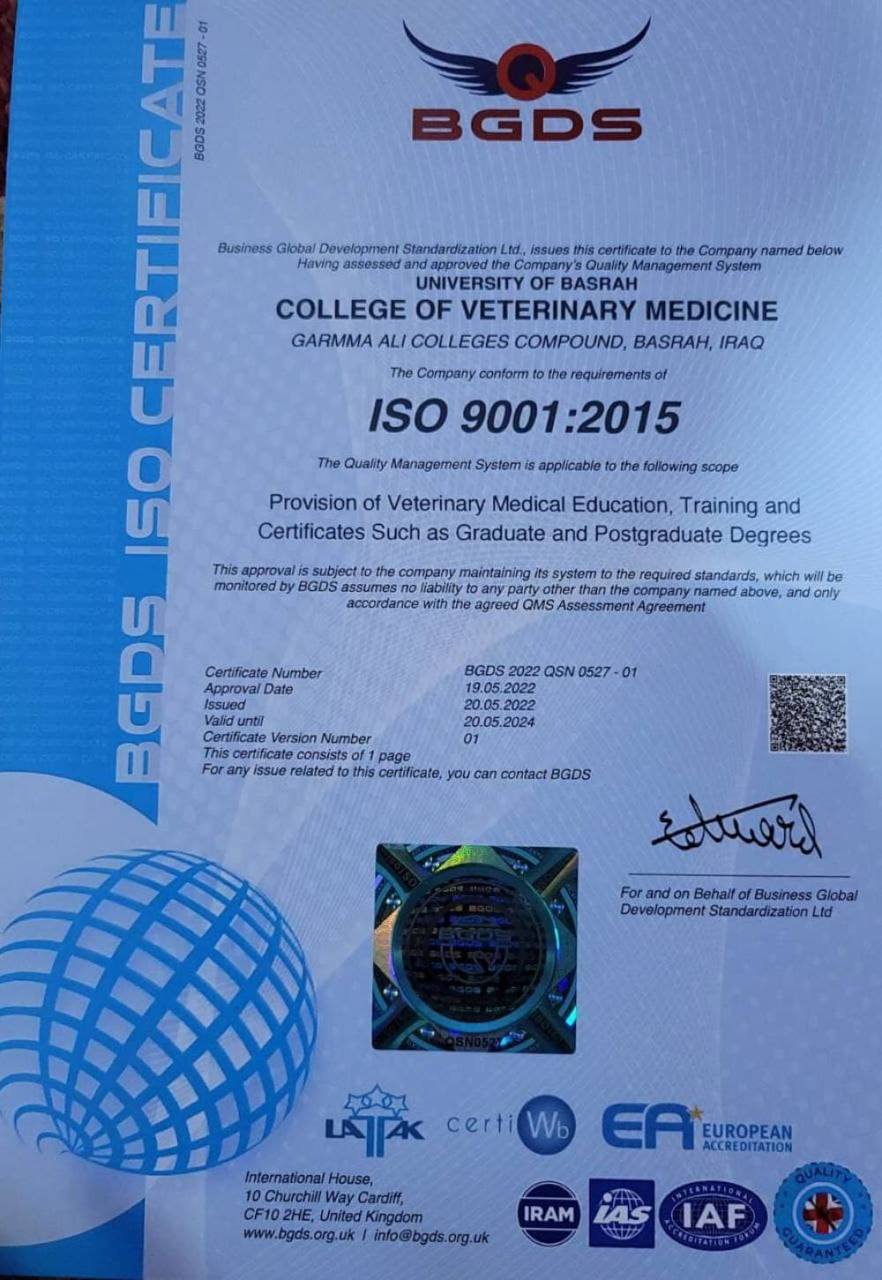 The College of Veterinary Medicine at the University of Basrah obtained the ISO 9001: 2015 international system certification.