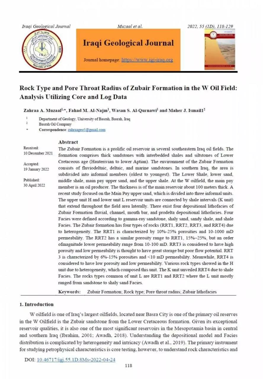 A scientific study was prepared at the College of Science at the University of Basrah by researchers Zahra Abdullah Mazal, Dr. Wasan Sabih Al-Qarnawi and Dr. Fahd Mansour Saqr, in addition to the researcher Maher Jassem Ismail from the Basra Oil Company entitled (Rock Type and Pore Throat Radius of Zubair Formation in the W Oil Field: Analysis Utilizing Core and Log Data).