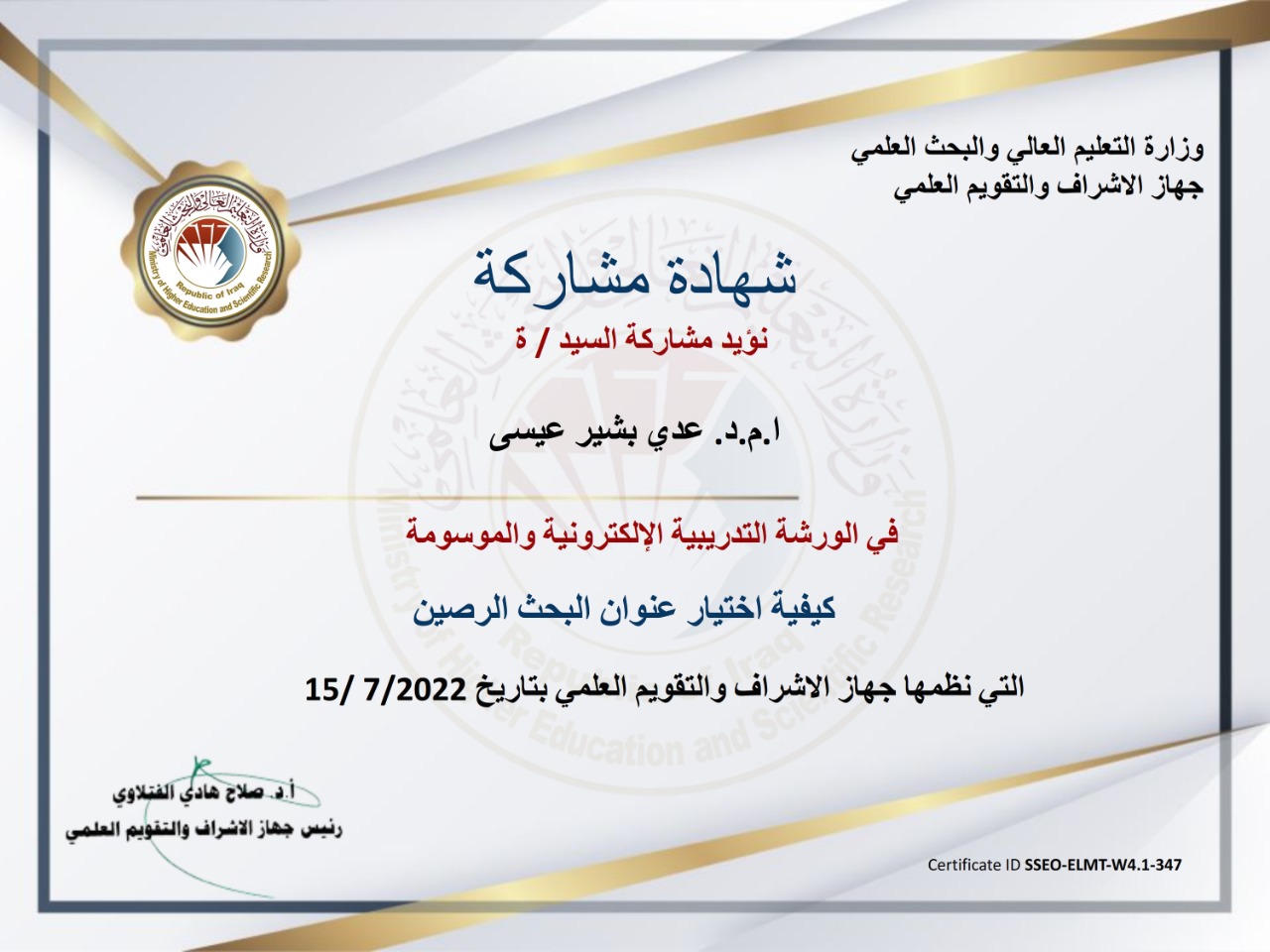 The director of the Ibn Sina Center for E-Learning at the University of Basra receives a certificate of participation from the Scientific Supervision and Evaluation Authority at the Ministry of Higher Education and Scientific Research