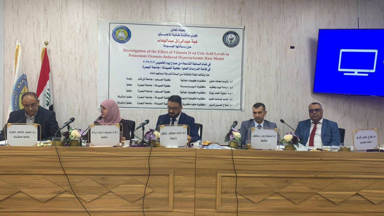 A master's thesis, titled (studying the effect of vitamin D on uric acid levels in a rat model with potassium axonate-induced hyperuricemia), was discussed at the College of Pharmacy at the University of Basrah.