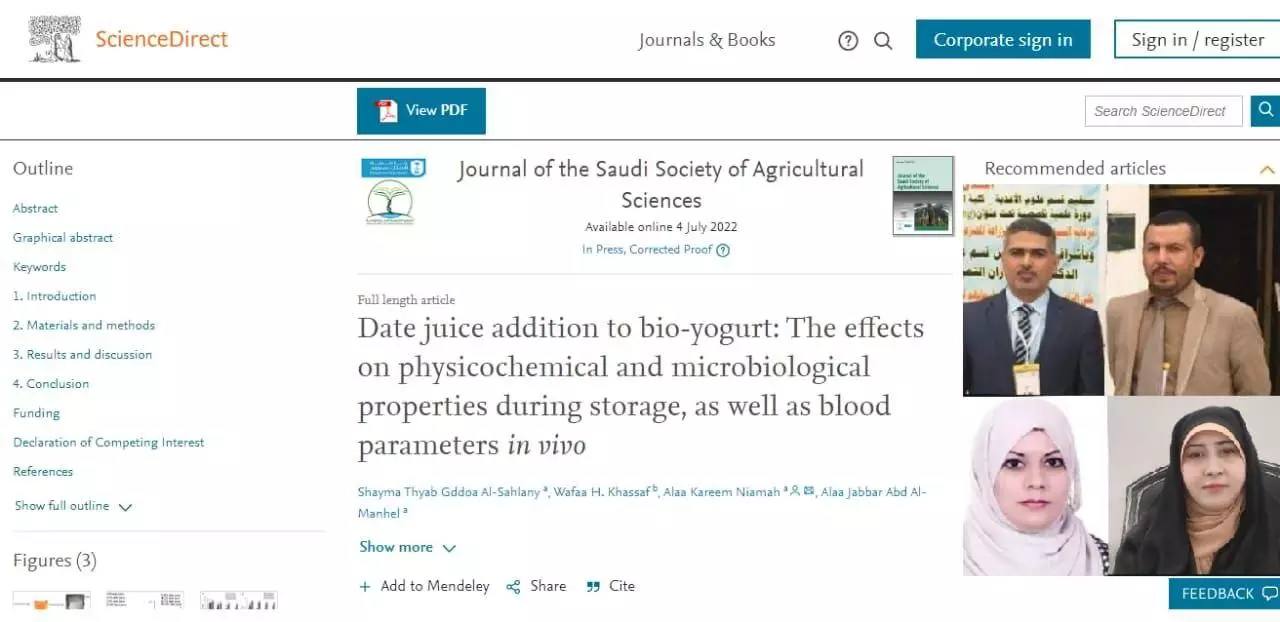 A research team from the College of Agriculture and the Palm Research Center at the University of Basrah, consisting of Dr. Shaima Dhiab Al-Sahlani, Dr. Alaa Karim Nehmeh, Dr. Alaa Jabbar Al-Manhal, and teacher Wafaa Hassaj Khassaf, published a scientific study on Date juice addition to bio-yogurt: The effects on physicochemical and microbiological properties during storage, as well as blood parameters in vivo.