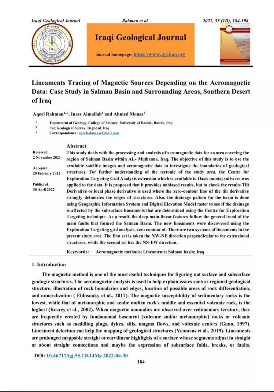 A scientific study at the College of Science at the University of Basrah, prepared by Dr. Enas Abdul Razzaq Al-Mallah, Dr. Ahmed Salem Musa and researcher Aqil Rahman Hassan, studied (Tracking Lines in Magnetic Sources Depending on Atmospheric Magnetic Data: A Case Study in Salman Basin and its Surrounding Southern Desert, Iraq).
