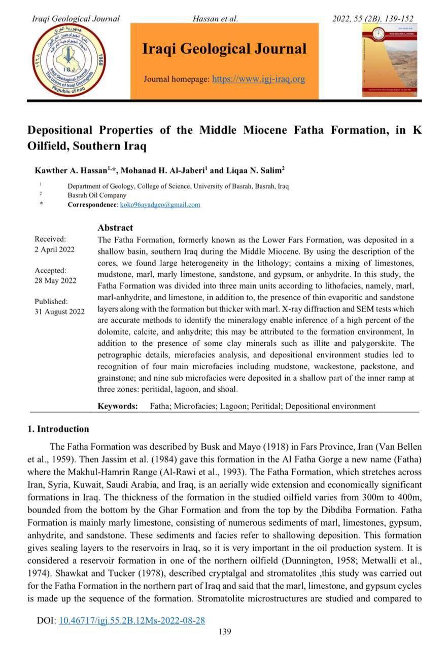 A scientific study, entitled (Depositional Properties of the Middle Miocene Fatha Formation, in K Oilfield, Southern Iraq), was prepared at the College of Science at the University of Basrah by Dr. Muhannad Hamid Al-Jabri and the two researchers Kawthar Iyad Hassan, and Liqaa Nima Salem from the Nahran Omar laboratories of the Basra Oil Company. The study was published in the Iraqi Geological Journal classified within Scopus containers Q3.