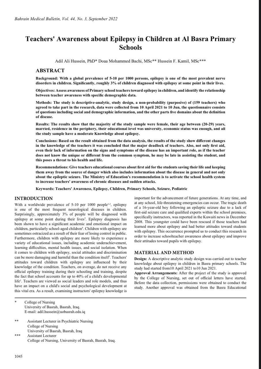 A research team at the College of Nursing at the University of Basrah headed by Dr. Adel Ali Hussein, researcher Doaa Muhammad Baji and researcher Hussein Fakher Kamel, published a scientific research on the awareness of primary school teachers about epilepsy in children in the city of Basra.