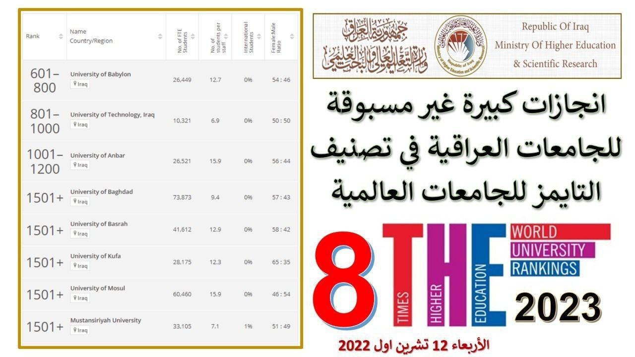 Iraqi universities achieved competitive ranks, represented by eight universities achieving important results in terms of global competition, and the universities of Baghdad, Basrah, Kufa, Mosul and Al-Mustansiriya ranke (+1501).