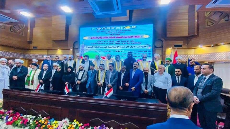 On the occasion of the anniversary of the Prophet’s birth and under the slogan (Islamic and national unity, challenges of the present and future prospects), the University of Basrah hosted the first conference of Islamic unity in the governorate, which was held by the Al-Ghari Foundation for Islamic Knowledge and in cooperation with the Sunni Endowment and a number of religious and cultural institutions in Basra Governorate and in the presence of the Director of the Sunni Endowment Sheikh Muhammad Al-Mulla, Basra Police Chief, and a number of academics, scholars and tribal sheikhs.