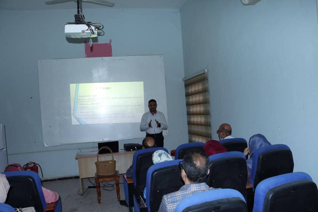 The seminar included a lecture given by Assistant Lecturer Hussein Muhammad Abboud explaining the Polymerase Chain Reaction (PCR) Technique, a technique widely used in molecular biology that derives its name from one of its basic elements, which is (DNA polymerase).