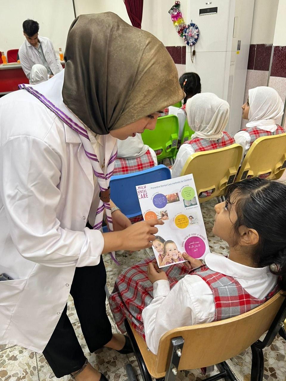 Dr. Hoda Jassim Jabr, the supervisor of the team, said, "The medical team, consisting of a group of fifth-stage students, provided awareness and educational programs by displaying some clips on hall screens explaining how to take care of teeth and the importance of visiting the dentist in order to preserve them, with practical lessons to teach Children correct steps to brushing their teeth.