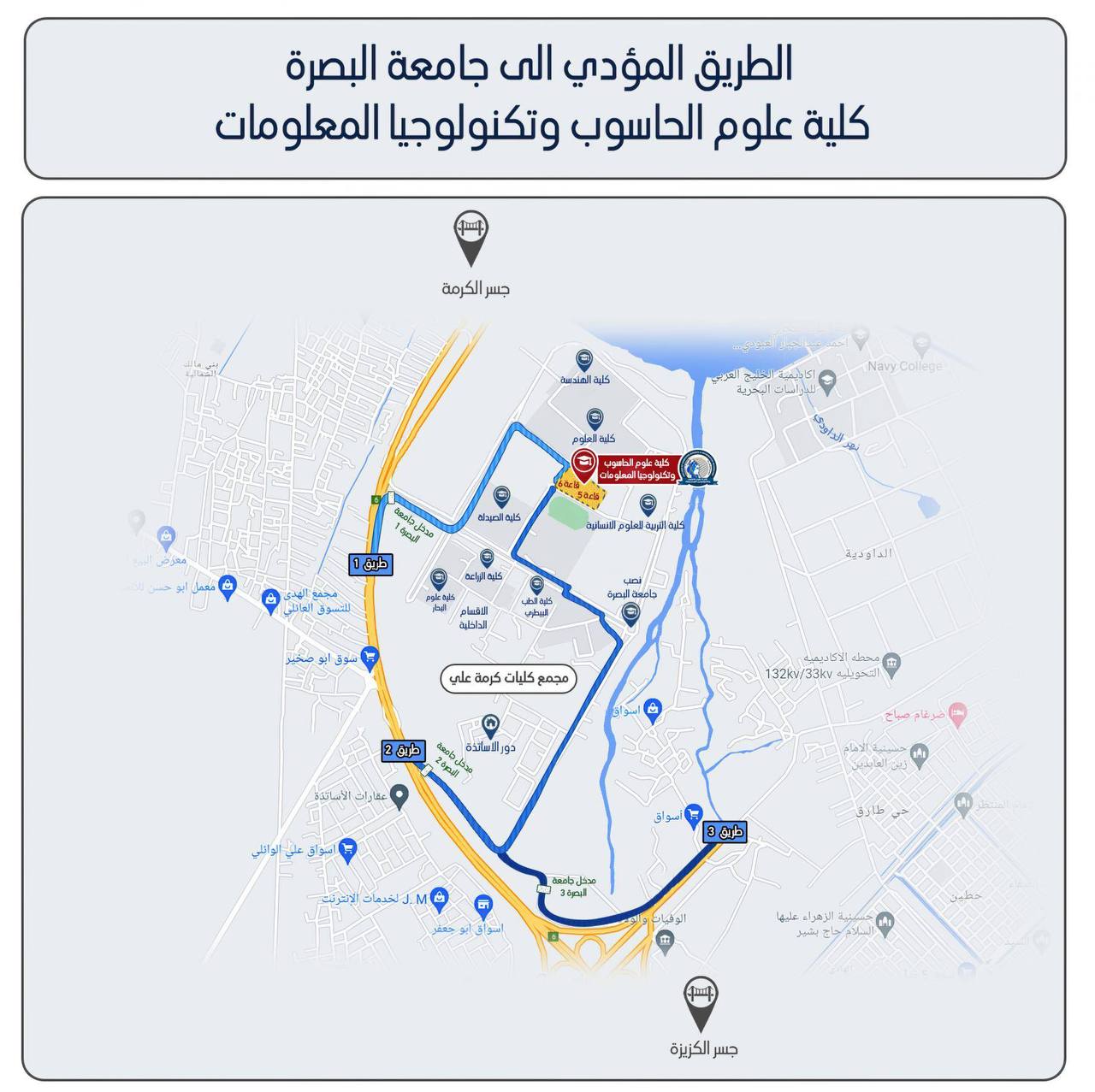 The following are ways to access the laboratories of the University of Basrah distributed in the College of Computer Science and Information Technology (Garmat Ali Colleges Complex), as well as in the College of Arts (Bab Al-Zubair Colleges Complex).
