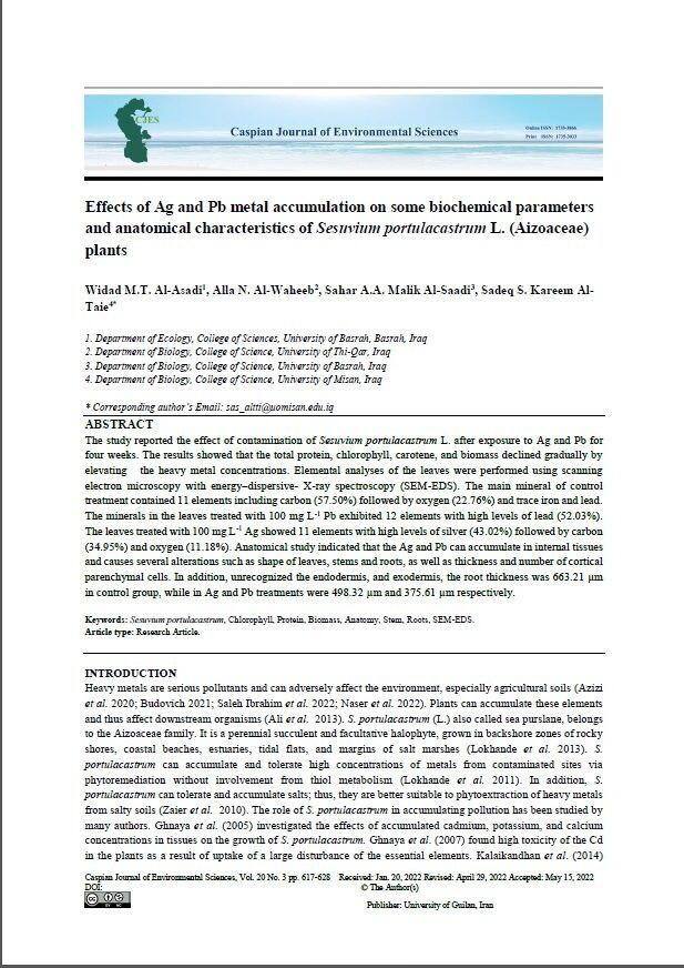 A scientific study at the College of Science, University of Basrah, investigated the effect of Ag and Pb accumulation on some biochemical variables and anatomical characteristics of Sesuvium portulacastrum L. (Aizoaceae) plants.