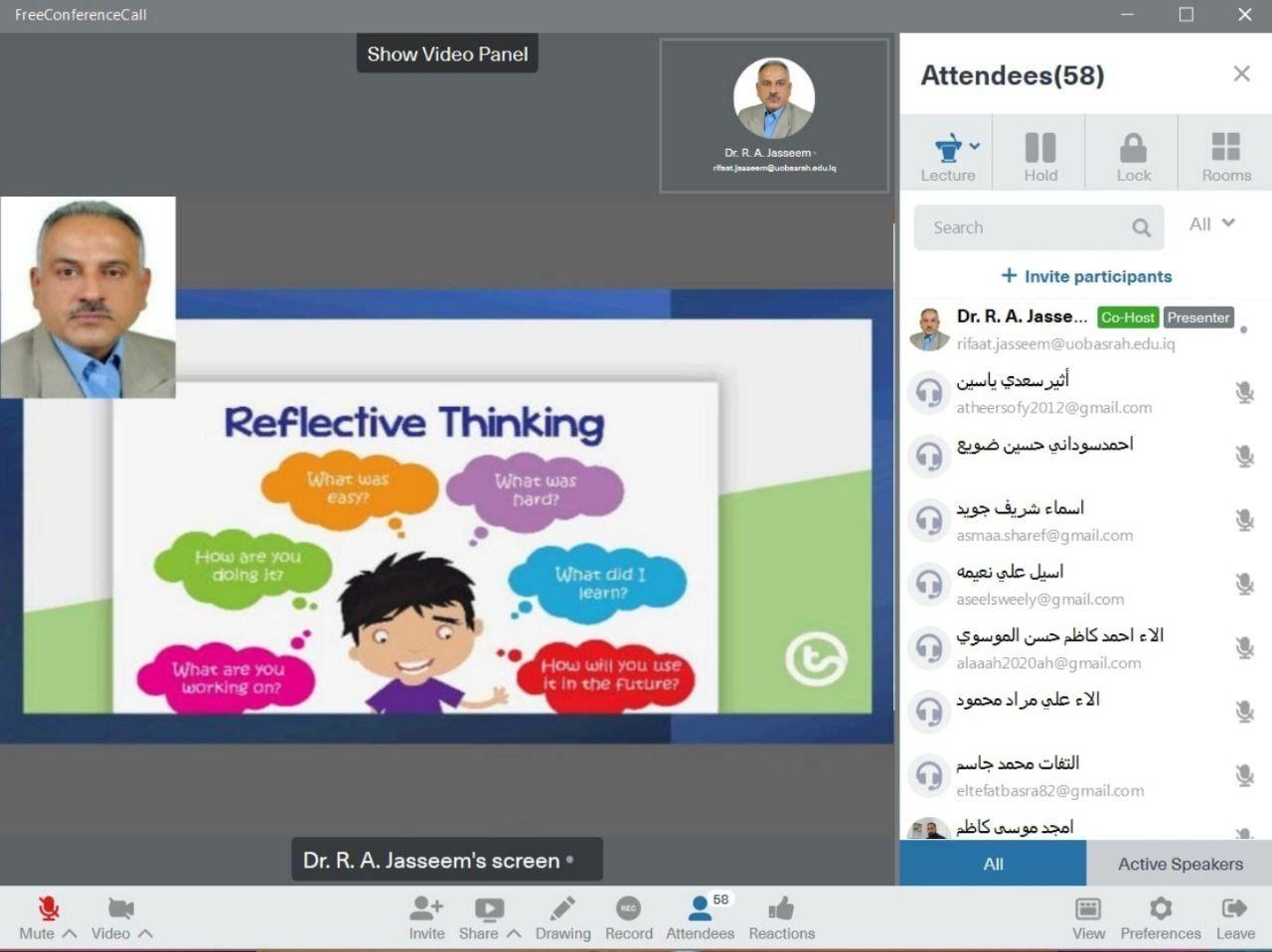 The workshop, presented by Dr. Refaat Abdullah Jassim, included an introduction to the nature and benefits of thinking, and meta-cognitive thinking skills for teachers and students and then explained some of the skills and applications above knowledge that the teacher can use personally to develop his mental skill, as well as teaching them to his students to enhance their learning process and improve their academic achievement, and their performance later in the labor market.