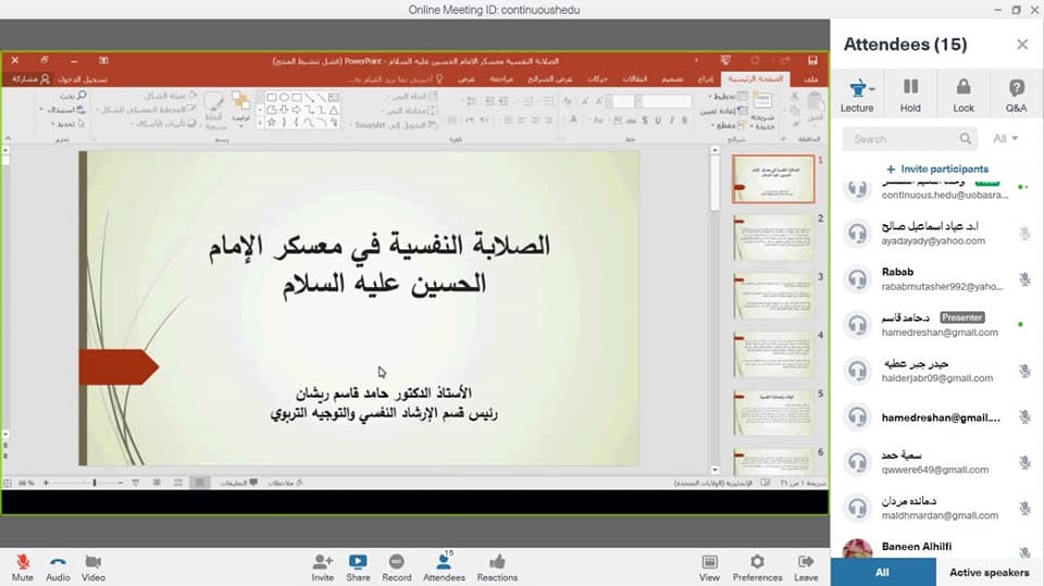 The Continuing Education Unit at the College of Education for Science organized a workshop on (the psychological toughness of Imam Hussein, peace be upon him), with the participation of researchers and specialists. The workshop included a lecture given by Prof. Dr. Hamid Qasim Rishan, during which he addressed (the psychological hardness of Imam Al-Hussein, his companions and his family,