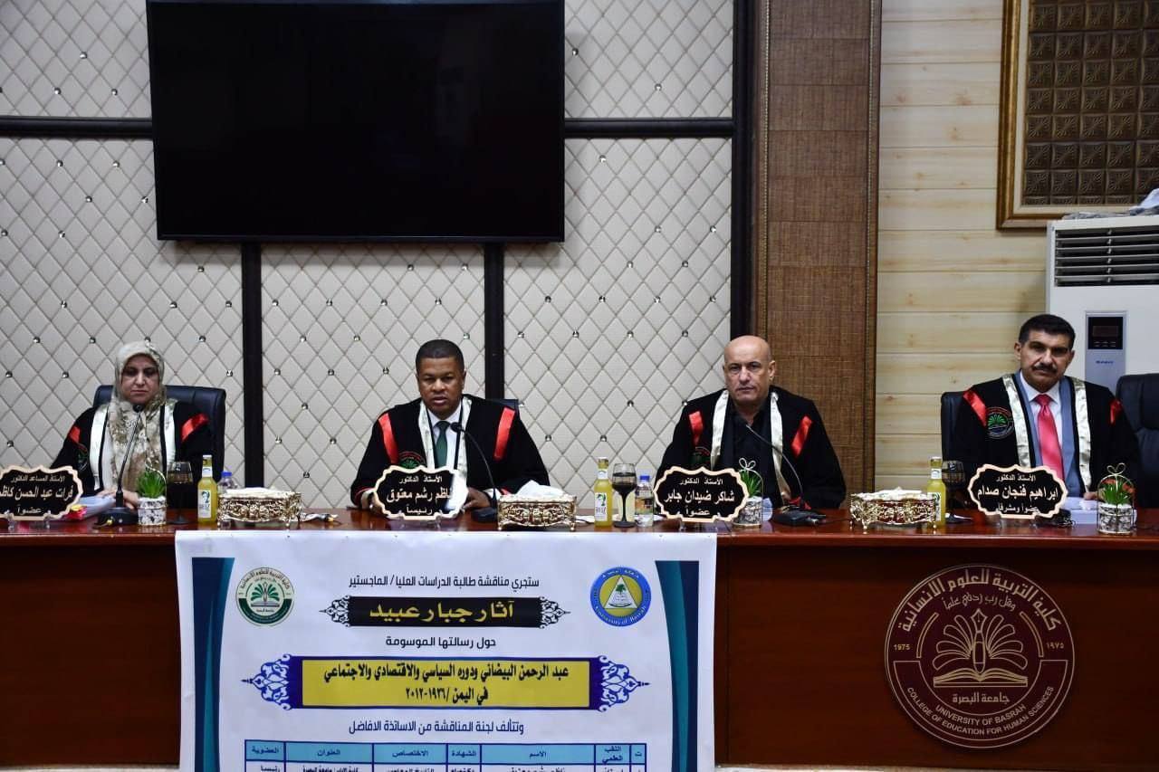 A master's thesis in the College of Education for Human Sciences at the University of Basrah discussed (Abdul Rahman Al-Baydani and his political, economic and social role in Yemen 1962-2012) by the student (Athar Jabbar Obaid).