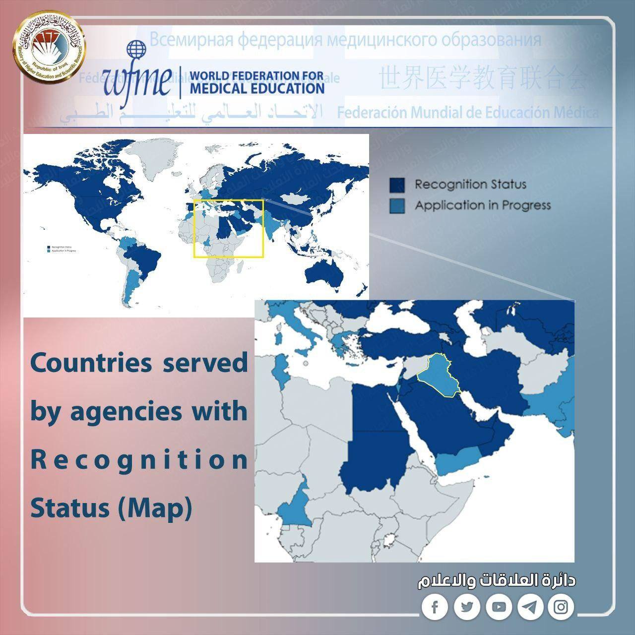Higher Education highlighted the official website of the federation (https://wfme.org/recognition/accrediting-agencies-status) demonstrated Iraq among the list of countries whose councils and competent bodies have achieved the necessary requirements to obtain international accreditation and they are now eligible to be listed in the world map of the councils that are making their way towards international accreditation from (WFME).