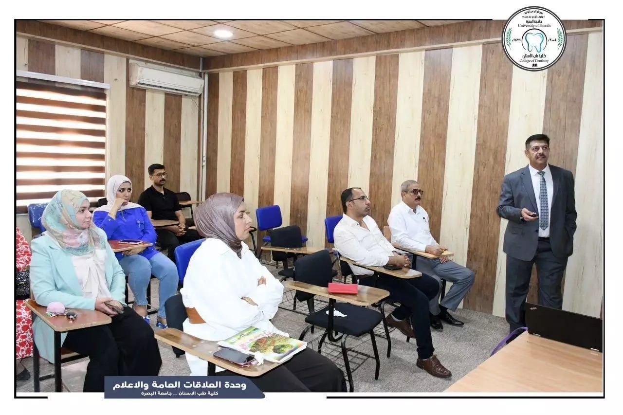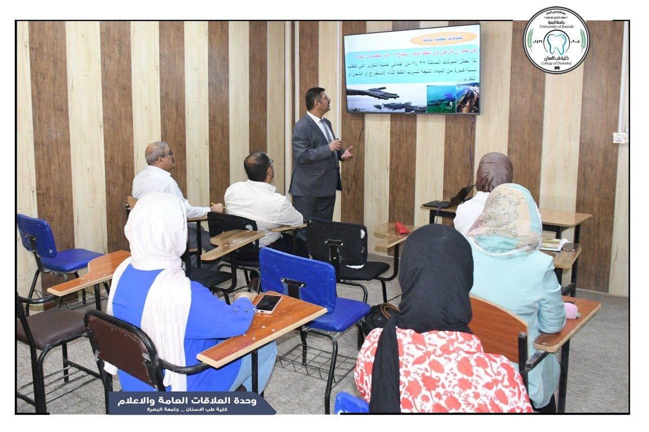The College of Dentistry at the University of Basrah organized a scientific lecture on the negative effects of fumes and gases emitted from oil wells on health and the environment, delivered by Dr. Hazem Saad Jabbar.