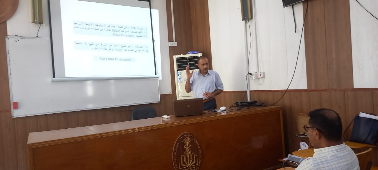 Our college organized an educational workshop on Polymerase chain reaction (PCR) technology, electrophoresis of DNA and the amplified gene. The lecture was attended by the teacher, Dr. Abdul Muttalib Abdullah Muhammad, and Assistant Professor Kholoud Abdul Karim. And its applications in various scientific and medical fields and its practical benefits, as well as introducing the devices, tools and materials attached to the work, clarifying the mechanism and interaction steps in amplifying the target genes from the DNA in the thermocycler, and how to detect the amplified gene after that with the electrophoresis device The second axis dealt with the practical part of the workshop, which included training the participants on the practical application of the technology in the microbiology laboratory to introduce them to how the devices work and how to deal with the materials used in the experiment according to the approved work protocol.
