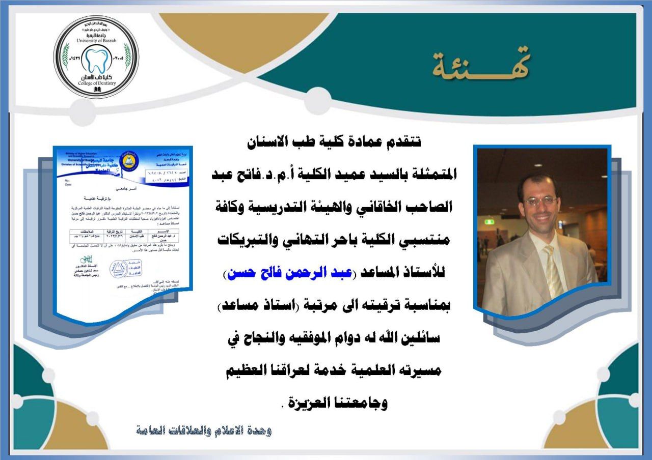 Congratulations from the Deanship of the College of Dentistry to Assistant Professor Abdul Rahman Faleh on the occasion of his promotion