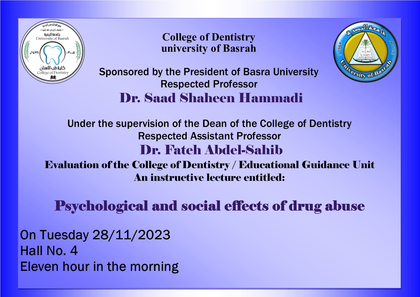The College of Dentistry will hold an orientation lecture entitled The psychological and social effects of drug abuse