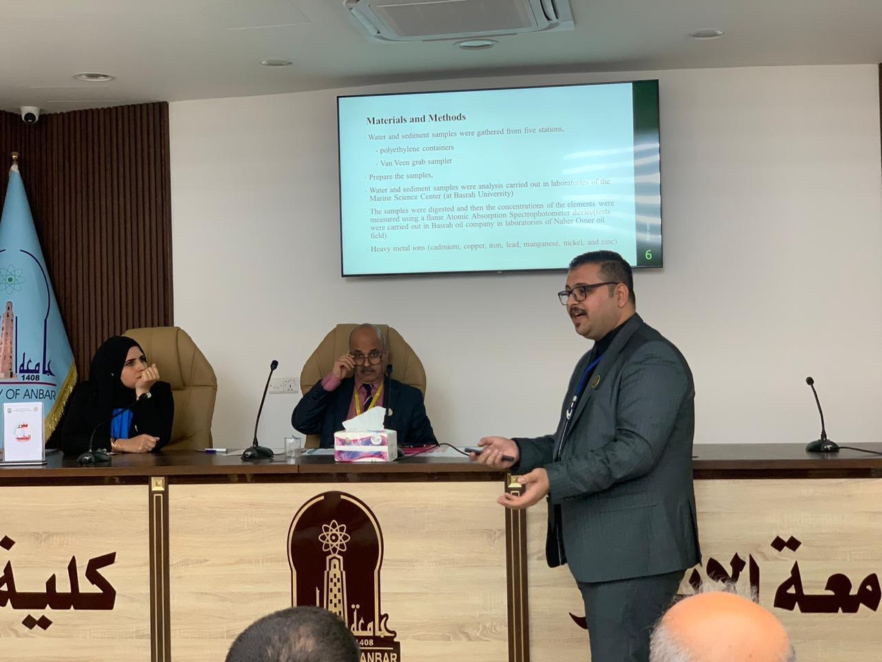 As for the lecturer, Ahmed Abu Al-Hail Hussein, his participation included presenting a research entitled (Evaluation of heavy metals in water and sediments accumulated due to sinkholes in the Shatt al-Arab), indicating the effects of these sinkholes on the environment and obtaining results that represented exceeding the recorded percentages of Iraqi and international water standards, and the evidence indicated that High levels of pollution in river sediments collected near sinkholes. The results of the research received praise from the attendees and the teacher received a certificate of appreciation from the conference administration.