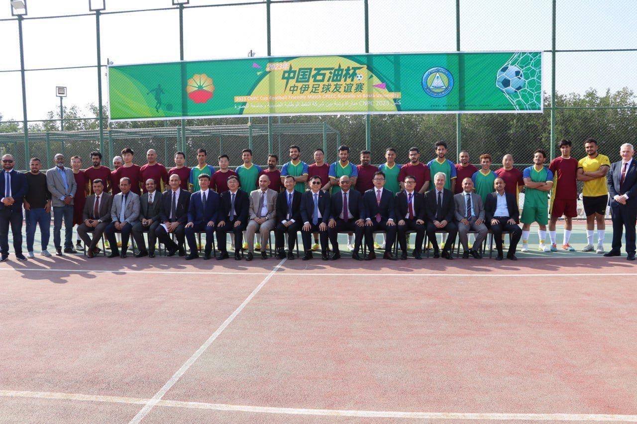 The visit included a meeting with Counselor Ji Gang and Consul Liao Ferui from the Chinese Consulate General in Basrah, Mr. Chen Xinrong, General Manager of PetroChina Middle East Company, Mr. Zhang Jianli, General Manager of PetroChina (Iraq) Rumaila Company, and Mr. Zhang Yusen, Executive Director of the China Petroleum and Construction Engineering Company, as well as A friendly football match took place between the College of Engineering team and the Chinese company team, and the match ended with the College of Engineering team winning 3-1 as part of the Chinese company’s Open Day initiative. Gifts were also distributed between the two sides.